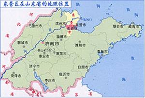 东营市东营区位于山东省东北部,黄河三角洲腹地。地跨东经118°12′42″~118°59′52″,北纬37°14′13″~37°31′57″。东濒渤海,西依黄河,南与广饶县、博兴县接壤,北与垦利县毗邻。东西最大横距 67.5公里 ,南北最大纵距 26.5公里 ,总面积1155.62平方公里。城区北距垦利县城 15公里 ,西距利津县城 20公里 ,南距广饶县城 50公里 ,西南到省会济南 220公里 ,西北到首都北京 450公里 。